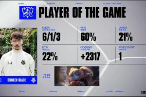 G2上单Brokenblade波比砍下6/1/3的战绩,拿下G2对阵BLG全场MVP