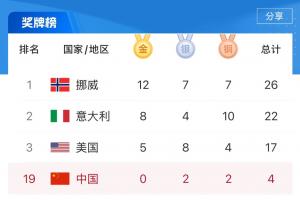 直播吧02月16日讯 米兰冬奥会第9个比赛日战罢,中国队仍2银2铜,排在第19。挪威12金7银7铜高居第一,意大利8金4银10铜第二,美国5金8银4铜第三。
