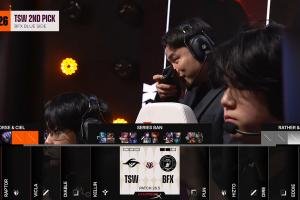 直播吧03月19日讯 BFX VS TSW比赛第三局,赛前BP阶段直播UI出现问题,双方队名反了👇