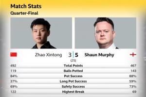 直播吧04月28日讯 2026斯诺克世锦赛1/4决赛,赵心童第一阶段3-5落后肖恩·墨菲,两人第一阶段数据对比如下。