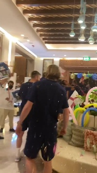 赛后英格兰队返回驻地酒店,受到球迷热烈欢迎。球员们加入狂欢人群中,一起庆祝。
