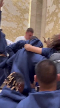 赛后,法国队回到了驻地酒店,球员们在酒店大堂高歌,狂欢庆祝着。