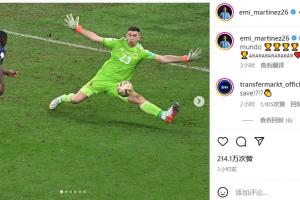 阿根廷门将马丁内斯在社媒晒出了自己在加时赛最后时刻扑出穆阿尼单刀瞬间,配文:“世界杯冠军!!!”