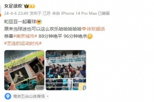 直播吧4月6日讯 今天,江苏无锡女足门将徐欢在个人社交媒体晒出现场看球照片,并表示当球迷也可以这么欢乐。