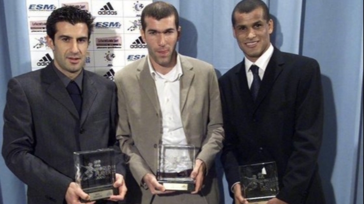 2000年的世界足球先生由法国传奇球星齐达内获得,第二第三分别是菲戈和里瓦尔多。上图为三人当年一起领奖的合影。