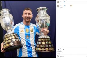 梅西赛后更新ins,手捧两座美洲杯冠军奖杯,同时梅西写道:又多一个🏆🏆