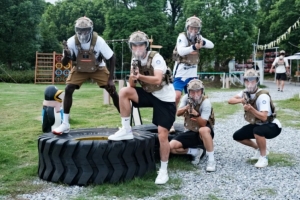 本次活动主要以团队间的游戏竞赛为主,为了让拓展活动更加有序地进行,在营地教练的指导下,全体成员分四组进行游戏。真人CS、蒙眼尖叫鸡、射箭PK、趣味拔河,这些项目不仅需要个人的勇气与毅力,更是考验团队成员间的默契协作。