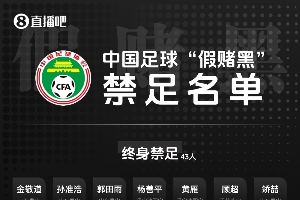直播吧09月10日讯 中国足球职业联赛“假赌黑”问题专项整治行动新闻发布会今日举行。足协官方公布禁足处罚,多达60人被罚,其中金敬道、孙准浩、郭田雨,顾超等人终身禁足,40岁汪嵩禁足5年。另外根据相关消息,足协将把禁足名单报至FIFA,由FIFA决定是否全球范围处罚。