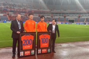 其中,刘洋代表山东泰山队出战200场、陈蒲代表山东泰山队出战100场。