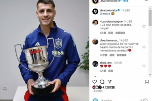 直播吧11月14日讯 西班牙前锋莫拉塔更新社媒动态,晒出手捧西甲本土最佳射手奖杯的照片。