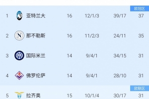 少赛一场的拉齐奥15轮吃到了4场败仗,但凭借10胜1平领先尤文3分。积分榜排名第一、第二的亚特兰大和那不勒斯,分别都吃到了3败。