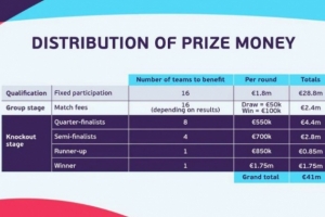 4100万欧元奖金当中,所有16支参赛队伍都将获得180万欧元参赛费用,小组赛胜者额外获得10万欧元,平局双方各获得5万欧元。参加淘汰赛的球队也将获得梯度奖金,分别为(每次晋级奖金叠加):