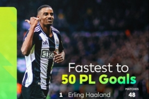 直播吧2月23日讯 在本轮英超纽卡对阵诺丁汉森林的比赛中,伊萨克已经梅开二度,他也打成了个人50粒英超进球里程碑。