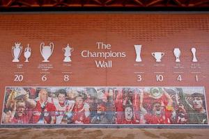 直播吧04月28日讯 利物浦官方晒出照片,安菲尔德主场内外的冠军墙已经更新完毕,利物浦的顶级联赛冠军数由19次更新为20次。
