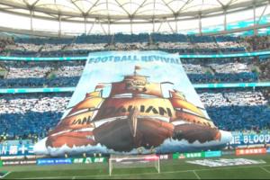 赛前,梭鱼湾看台上展示出大型TIFO足球复兴(Football revival)。