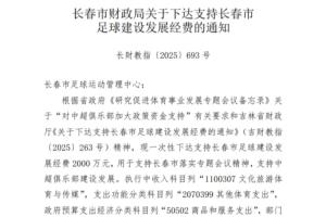 直播吧06月17日讯 长春市财政局发布“关于下达支持长春市足球建设发展经费的通知”:现一次性下达支持长春市足球建设发展经费2000万元,用于支持长春市落实专题会议精神,支持中超俱乐部建设发展。