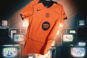这款球衣于8月19日起在巴塞罗那足球俱乐部和耐克实体店及线上门店发售,它重现了耐克21世纪初Total 90系列的精髓,该系列以大胆的设计和卓越的技术品质而著称。球衣(以及短裤和球袜)以醒目的亮芒果色为主色调,领口和后背饰有海军蓝条纹,正面则以几何图案的滚边装饰,中间印有Spotify的标志。与往常一样,男款球衣的袖子上印有 Ambilight TV 标志,女款球衣的袖子上印有 BIMBO 标志。