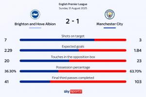 直播吧08月31日讯 英超第3轮,曼城1-2遭布莱顿逆转,蓝月亮新赛季开赛3轮1胜2负仅积3分。