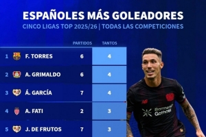 直播吧9月23日讯 德国转会市场统计了五大联赛西班牙球员本赛季的进球数量,并列出榜单,费兰-托雷斯、格里马尔多、A-加西亚4球居首。