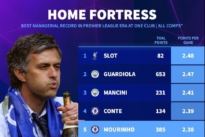 直播吧10月3日讯 根据德转统计,在英超执教单一俱乐部各项赛事主场场均得分榜上,斯洛特位列第一,瓜迪奥拉第二,穆里尼奥第五,弗格森第六。