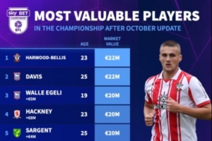 直播吧10月6日讯 德转更新英冠球员身价,在目前的英冠球员身价中,南安普顿球员贝利斯和伊镇球员戴维斯2200万欧并列第一。