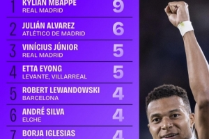 直播吧10月7日讯 日前,Squawka统计了本赛季西甲射手榜,姆巴佩9球居首。