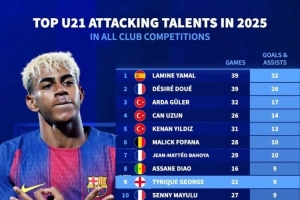 直播吧10月11日讯 德国转会市场列出了2025年五大联赛U21球员参与进球榜,亚马尔32球居首,杜埃26球次席。