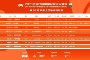 直播吧10月11日讯 2025华润饮料中甲联赛第26轮裁判选派结果公布,重庆铜梁龙vs佛山南狮、青岛红狮vs广西平果两场比赛安排有VAR裁判。