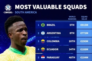 直播吧10月12日讯 德国转会市场网公布南美足联国家队身价排名,巴西队以9.15亿欧元总身价稳居榜首,世界杯冠军阿根廷队以7.72亿欧元位列第二。