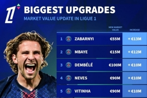 直播吧10月12日讯 德国转会市场更新法甲球员的身价,并列出身价上涨榜单,扎巴尔尼+1300万欧居首,巴黎球员占据前7名。