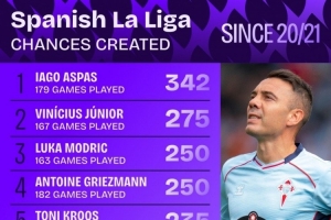 直播吧10月12日讯 Squawka统计了20-21赛季以来球员在西甲创造机会的次数,并列出榜单,阿斯帕斯342次居首,维尼修斯275次第二。