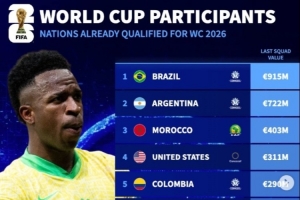 直播吧10月14日讯 德转列出已经锁定2026年世界杯参赛资格的球队的身价排行榜,巴西、阿根廷前二,佛得角第20位。