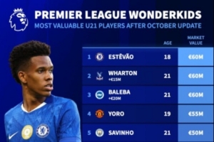 直播吧10月18日讯 德转在北京时间本月17日更新英超球员身价,同时列出了英超U21球员身价榜,埃斯特旺、亚当-沃顿、巴莱巴三人6000万欧身价最高。