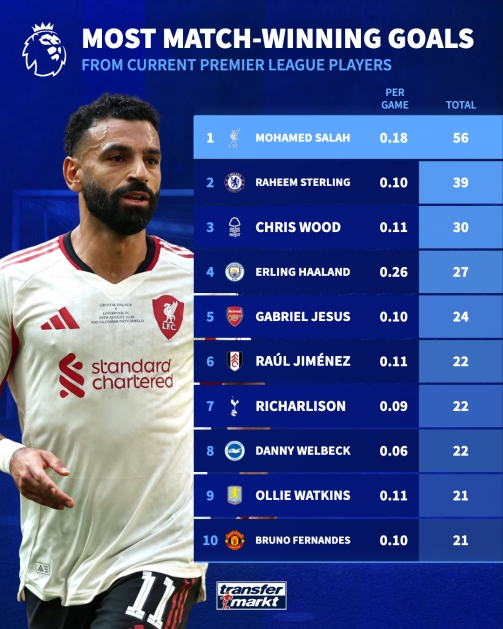 直播吧10月18日讯 德国转会市场盘点了现役英超球员打进制胜球排行情况,萨拉赫以56球遥遥领先,斯特林以39球位居次席。