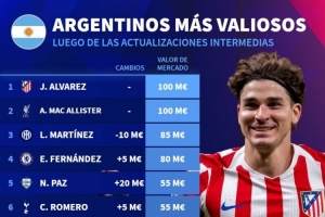 直播吧10月18日讯 德国转会市场更新了部分球员的身兼,并列出阿根廷球员德转身价排名,阿尔瓦雷斯、麦卡利斯特1亿欧居首。
