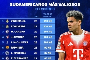 直播吧10月18日讯 德国转会市场更新了部分球员的身价,并列出南美球员德转身价排名,维尼修斯、巴尔韦德排名前两位。