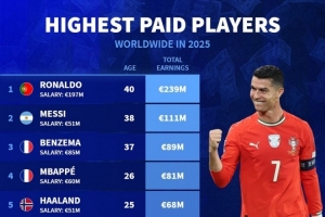 直播吧10月18日讯 德国转会市场列出2025年球员收入榜单,C罗2.39亿欧居首,梅西1.11亿欧次席。