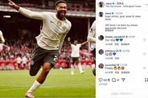 直播吧10月18日讯 今天,切尔西在英超3-0击败诺丁汉森林,里斯-詹姆斯赛后在Instagram发文,庆祝个人蓝军生涯200场里程碑。