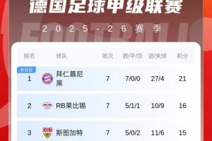 绝对统治力!德甲积分榜:拜仁7轮全胜5分领跑,多特赛季首败