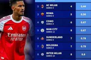 直播吧10月22日讯 凌晨欧冠比赛阿森纳4-0完胜马竞,赛后德转官方统计本赛季五大联赛球队丢球最少榜,阿森纳12场仅丢3球排名榜单第一。以下是根据场均丢球数的排名↓