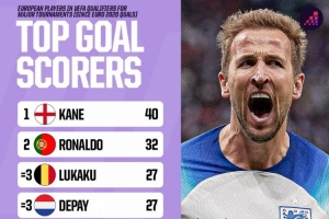 直播吧11月17日讯 Opta统计了球员在近4届欧洲杯预选赛、世预赛欧洲区比赛的进球数量,并列出榜单,凯恩40球居首。