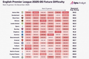 直播吧12月2日讯 opta分析了英超各队未来6轮的赛程难易程度,维拉赛程最为艰难,利物浦最容易。曼城第二容易,曼联并列第三容易。