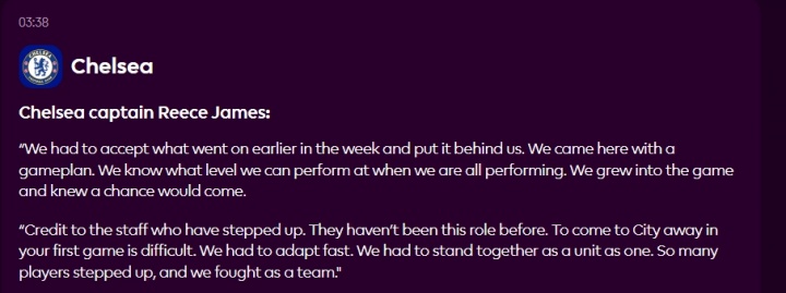 “要特别感谢那些挺身而出的工作人员,他们之前从未担任过这样的角色。在客场对阵曼城,这是非常困难的。我们必须迅速适应。我们必须作为一个整体团结一致,很多球员都站了出来,我们作为一个团队拼搏战斗。”