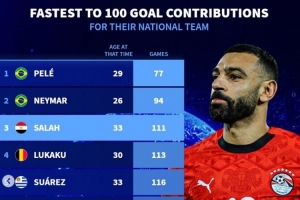 直播吧1月11日讯 埃及在非洲杯八强战3-2淘汰科特迪瓦,萨拉赫传射建功,也达成了国家队直接参与100球里程碑。《转会市场》统计显示他也是历史第三快达成国家队直接参与100球的球员。