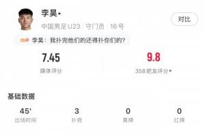 昊神!李昊半场3次扑救获评7.45分,吧友直接打9.8分!