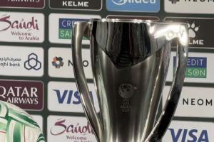 发布会现场,U23亚洲杯冠军奖杯被放在发布会的桌上。