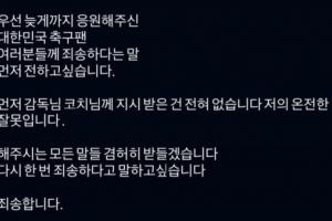 黄材润:首先,我要向所有一直为我们加油到深夜的韩国球迷们道歉。我没有收到任何来自教练指示,这完全是我的错。我会虚心接受大家的所有批评指正。再次向大家道歉,对不起。