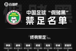 直播吧01月29日讯 中国足协正式公布了“假赌黑”专项整治行动受到处罚的76人人员名单。对经人民法院认定构成犯罪的陈戌源、杜兆才、李铁、王小平、郝伟、张鹭、秦升等73名从业人员,给予终身禁止从事任何与足球有关的活动的处罚。