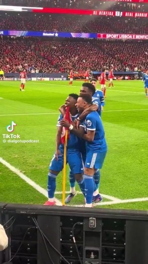 维尼修斯跳舞庆祝后,吕迪格向本菲卡球迷作出致歉手势