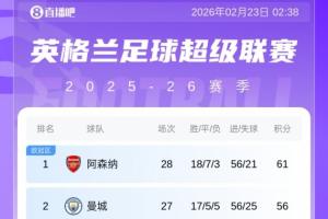 直播吧2月23日讯 英超第27轮,热刺1-4阿森纳,此役过后枪手多赛一场(第31轮一场比赛提前进行,阿森纳2-2狼队),积分榜上的优势仍是5分。